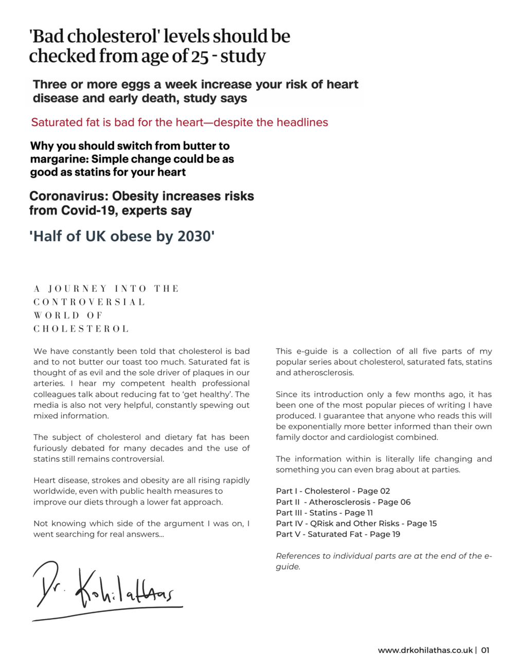 If you answered yes, then this is the guide for you. With over 150 references, this guide delves into the science of atherosclerosis, the biggest killer in the world. It also scientifically analyses the risks of statins and saturated fat.